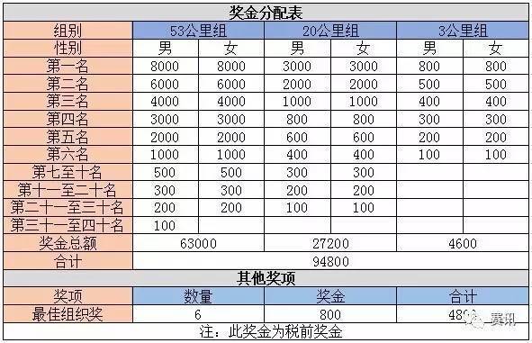 看完这个奖金分配表,小编觉得组委会才是真正的土豪,除了种类繁多的补给让人觉得很体贴,而这丰厚的奖金更是让小编按耐不住、跃跃欲试。本次奖金数额更是国内同等规格越野赛中奖金总额最高的比赛之一,同时还拥有广泛的获奖范围。