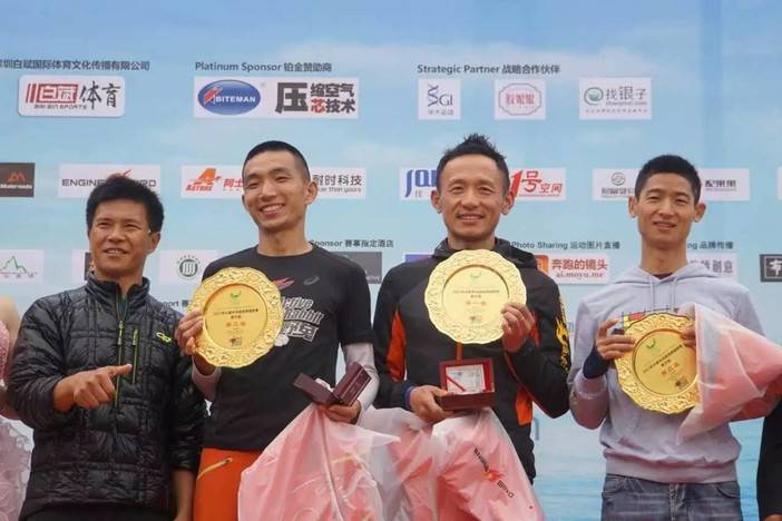 赛事创始人白斌与男子168KM组的冠亚季军合影