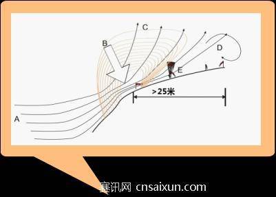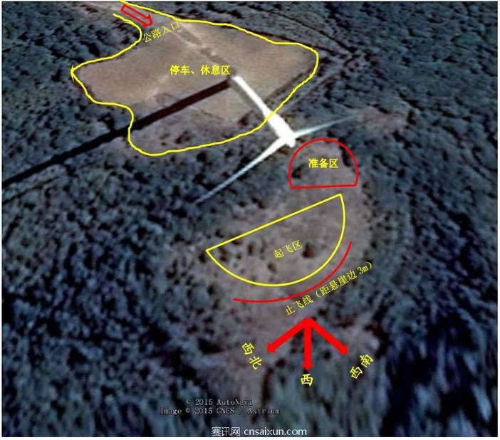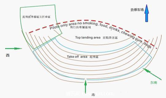 4、迫降说明:从2号起飞场起飞后,若遇到强上升、下沉气流,风力风向加大或改变等情况导致消高困难或高度迅速下降而没法进入主降落场降落时,请根据实际情况,选择备用降落场安全降落。