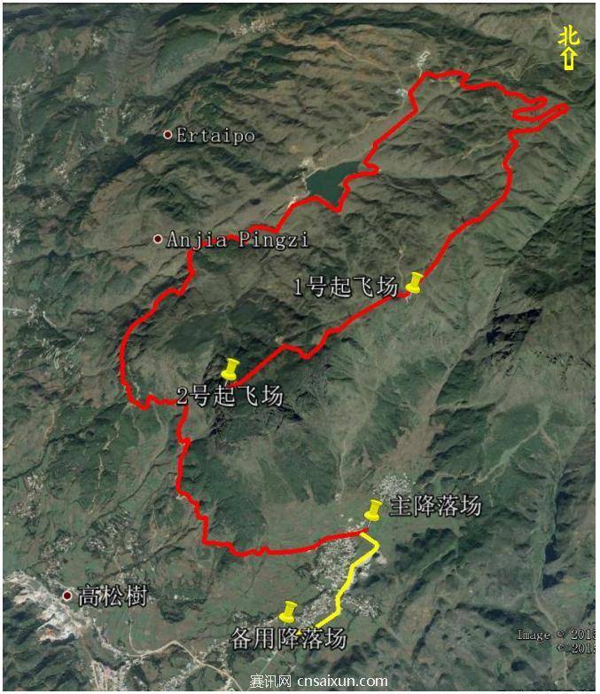 3、航迹说明:1号起飞场可直接看到主降落场和备用降落场;2号起飞场起飞后,需向西南—南—东南方向转弯绕过山脊,方可看到主降落场和备用降落场。进场后注意观察地面风力风向,选择合适的航线进场安全降落。