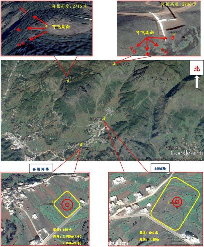1、起飞场:共有1号、2号两个起飞场。1号起飞场海拔高度2706米,可飞风向为东、东南、南西南风向;2号起飞场海拔高度2715米,可飞风向为西南、西、西北风向。