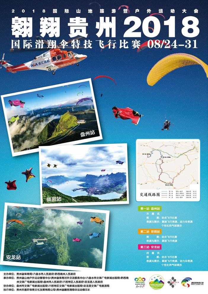 2018翱翔贵州—国际滑翔伞特技飞行比赛是中国贵州首届举办的高水平国际性滑翔伞赛事,届时将有120余名来自全世界的特技飞行、翼装飞行、定点飞行等全外籍运动员参与,除了常规的定点比赛以外,还增加了特技飞行比赛,此次赛事也是中国贵州第一次大规模举办的高规格、高水准国际滑翔伞赛事,定会引起中国国内滑翔伞运动热潮。高水平赛事看点十足,华丽的空翻、直升机、接地螺旋、非对称土星、节奏土星、回环筋斗、米丝蒂翻转等飞行特技展示,为观众带来一场震撼的视觉盛宴和前所未有的刺激感,可以说本次赛事相比其他滑翔伞赛事,是最精彩、最刺激、最具观赏性的一场比赛。