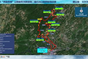 1.朝山组(60KM)赛道路线:音乐喷泉广场(起点)—城关镇—夏家屯—曹家湾—洪冲(CP2/SP1)—冬瓜冲—牌楼冲—云台山景区大门(CP3/SP2)—道院—渡云桥(CP4)—狮子口—屯上—高家庄—芹菜塘(CP5/SP3)—老蛇孔—大田佬—泡木林(CP6)—平头—大庆—黑冲—大园子(SP4)—贵州杉木河景区—杉木河漂流起点(CP7/SP5)—大坪—水缸河(CP8/SP6)—翁柱—乃子岩—老鹳岩—中寨—音乐喷泉广场(终点)