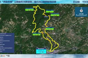 2.云山组(45KM)赛道路线:音乐喷泉广场(起点)—城关镇—夏家屯—曹家湾—洪冲(CP2/SP1)—冬瓜冲—牌楼冲—云台山景区大门(CP3/SP2)—道院—渡云桥(CP4)—贵州杉木河景区—杉木河漂流起点(CP7/SP5)—大坪—水缸河(CP8/SP6)—翁柱—乃子岩—老鹳岩—中寨—音乐喷泉广场(终点)云山组(45KM)赛道图