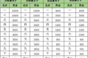 (三)总奖金 15万元人民币。男子、女子个人升降赛;男子、女子个人登高赛, 2个项目分别录取前12名,颁发证书和奖金;升降赛前三名颁奖牌。