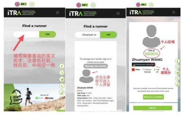 3.ITRA英文名字,以个人ITRA账号为准,请查询后正确填写,ITRA官网:https://itra.run/Runners/FindARunner