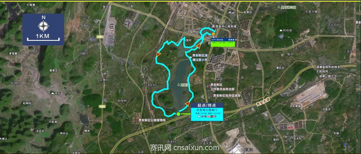 2.月亮组(12KM)赛道路线:月亮湖公园南门(起点)→月亮湖路→团寨→杨梅寨(CP1饮水站)→新民村→汤庄村→月亮湖路→月亮湖公园南门(终点)