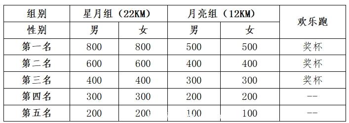 (一)对星月组(22KM)、月亮组(12KM)、欢乐跑(3.3KM)组别的参赛者,对到达终点的所有参赛者进行排名与奖励,奖励如下:
