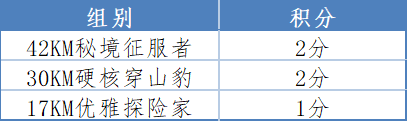 (4)活动积分按照各竞赛组别对应公里数按1分递减的方式进行积分,示例如下(以42KM为例,积分如下):