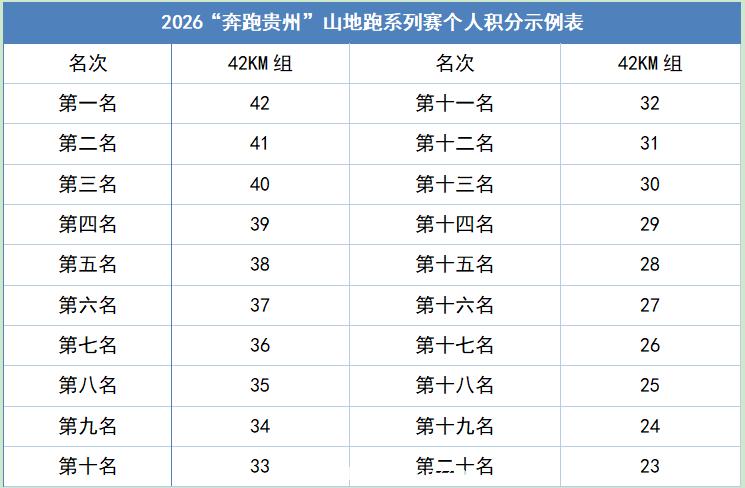 本次活动设2026“奔跑贵州”山地跑系列赛积分,该系列赛均采用此积分规则;